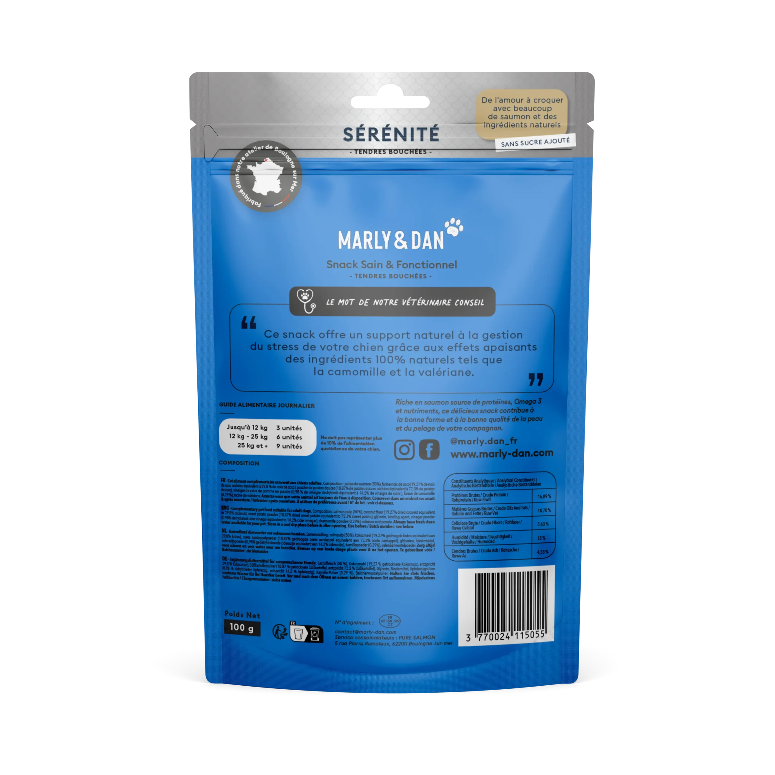 Les friandises Sérénité sont de petites bouchées fonctionnelles pensées pour apaiser ton chien au quotidien 🐶. Grâce à leur recette à base de saumon, camomille et valériane, elles l’aident à se détendre naturellement et à mieux gérer les moments de stress 🌿.